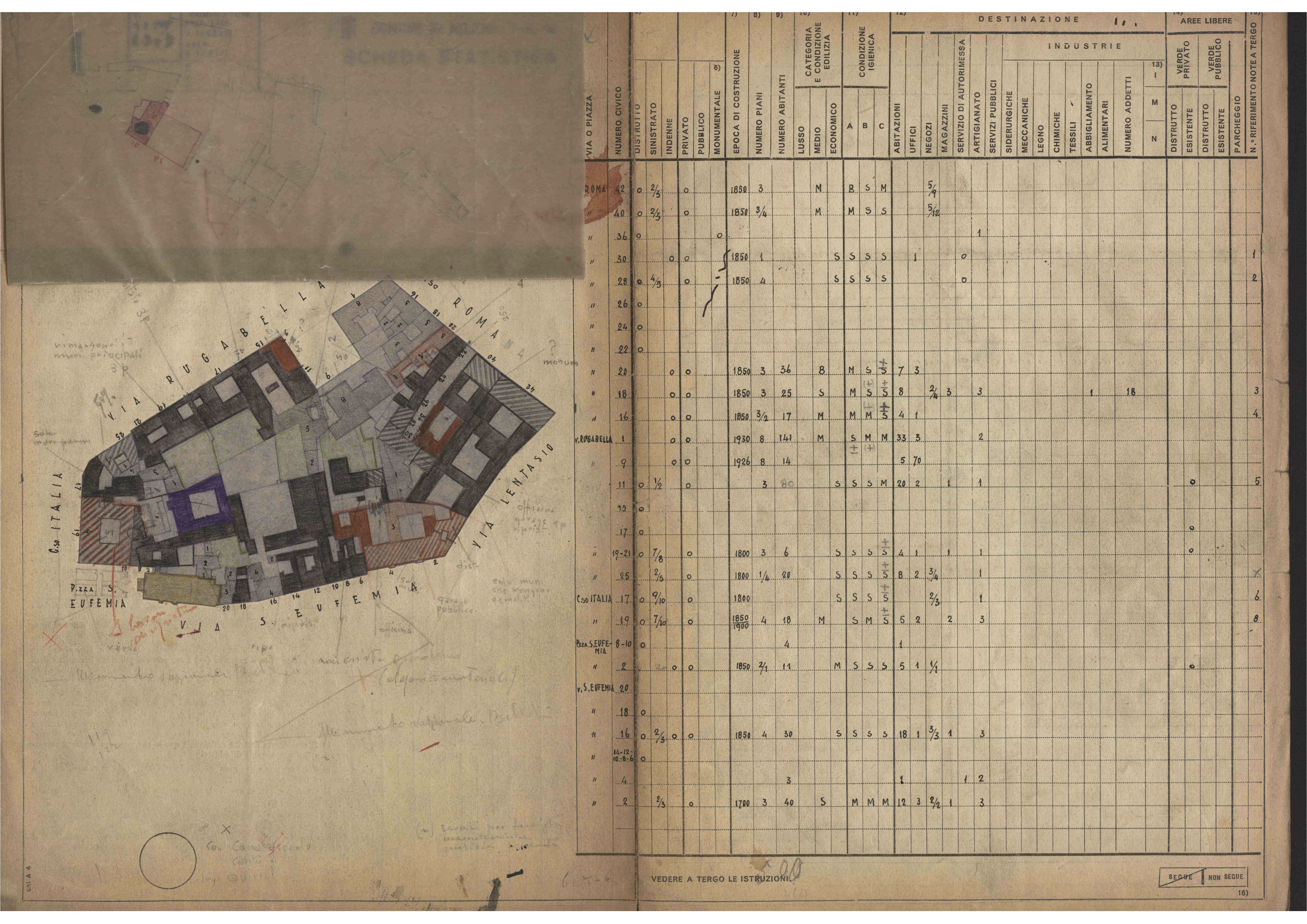 Milan Urban Census 1946 (made after the bombing and in preparation for the 1953 PRG): city planning sheet no. 174 (Piazza Vetra, Via Chiusa, Via Pioppette, Corso di Porta Ticinese, Via Pio IV). ©Comune di Milano
