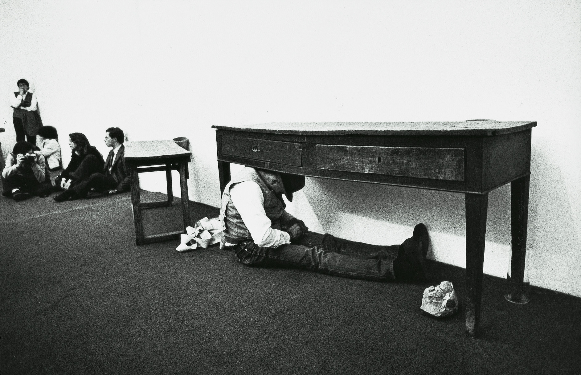 Joseph Beuys performing “Terremoto in Palazzo” (Earthquake in Palace) at the Modern Art Agency Naples, 1981. ©Collezione Archivio Amelio-Santamaria