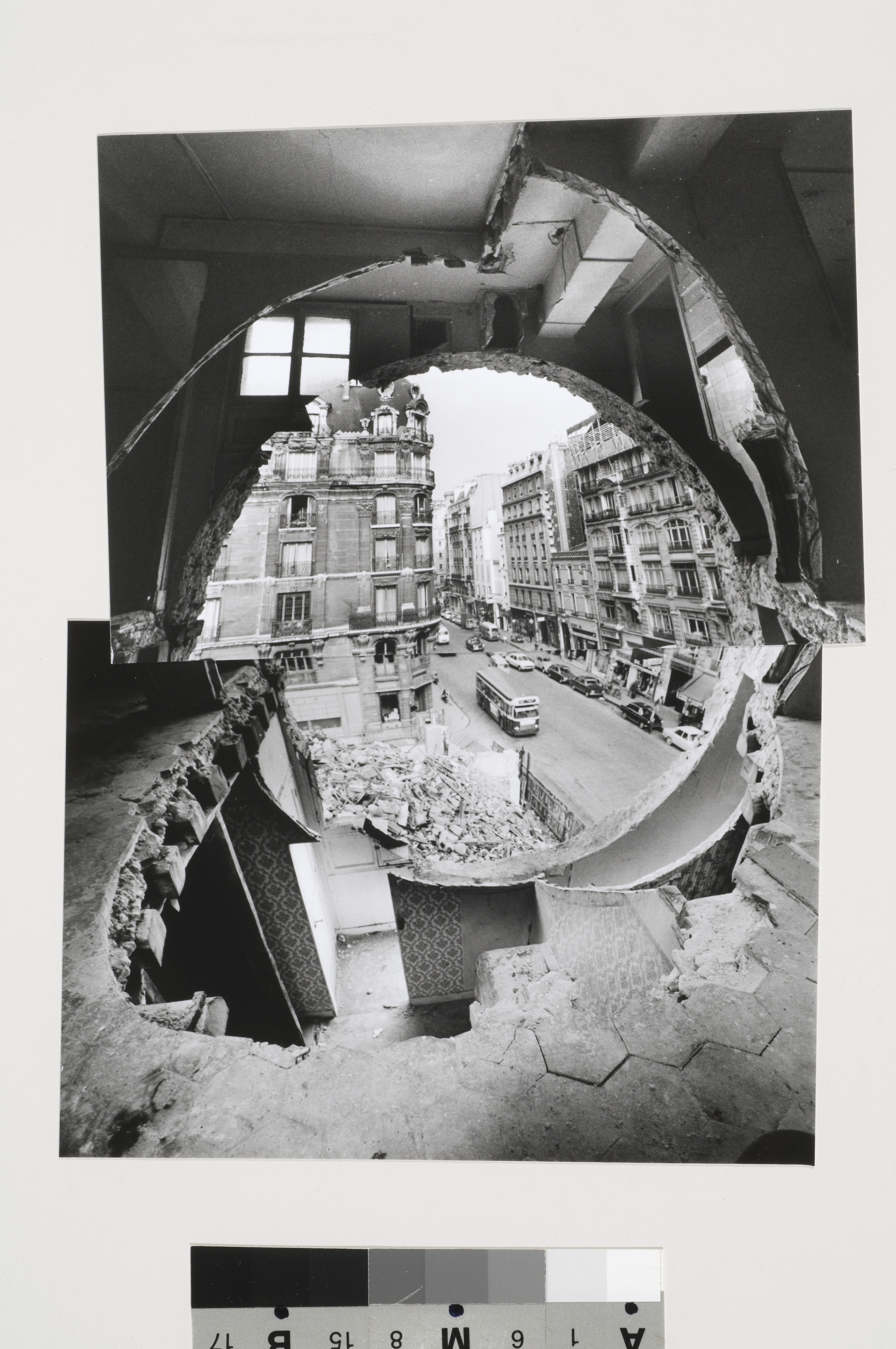 Gordon Matta-Clark, Conical Intersect, 1975. The photomontage is composed of two photographs taped together on the recto, 17,1x14,5cm (photomontage). Credits: Canadian Centre for Architecture, Gift of Estate of Gordon Matta-Clark. ©Estate of Gordon Matta-Clark/SODRAC