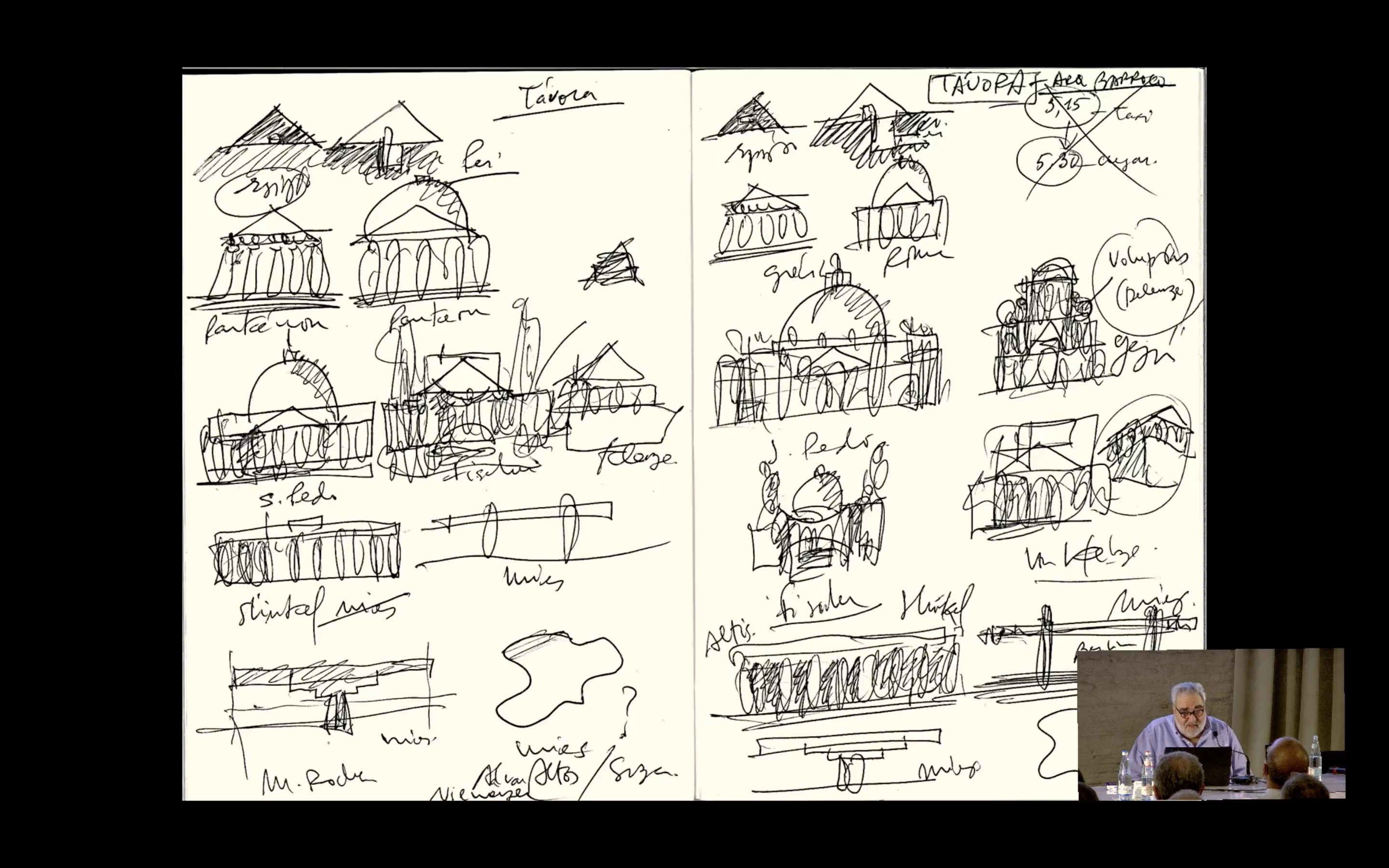 After the Egyptian pyramid there’s the Parthenon, whose pediment has the same shape; then, the Romans arrive and take the Greek temple and add a dome. And later the Baroque. Bernini uses this architectural form opening its arms, and takes over the city. The Baroque that begins to transform architecture into urbanism. Sixtus Quintus with the obelisks, the radial city, and all the rest. Afterwards, the very complex development of the Baroque by the Germans, such as Fisher von Erlach and that enormous drama. So much drama that people get tired and move back again. Because I think that History works in this way [Souto mimes a sine wave]. And here again comes the longevity of the classic. With Leo von Klenze and the pure Greek temple, which has greatly influenced Schinkel who builds the Altes Museum…I don't know, I haven't counted it, with fifteen, twenty or twenty-five columns…and Mies who says “but if I have steel, why do I take twenty-five columns, if I can do everything with two, or one!?”. And Mies himself built, I think in 1925 or 1924, this glass skyscraper, with organic shapes, and the same building is also built after by Alvar Aalto, Siza and many others.