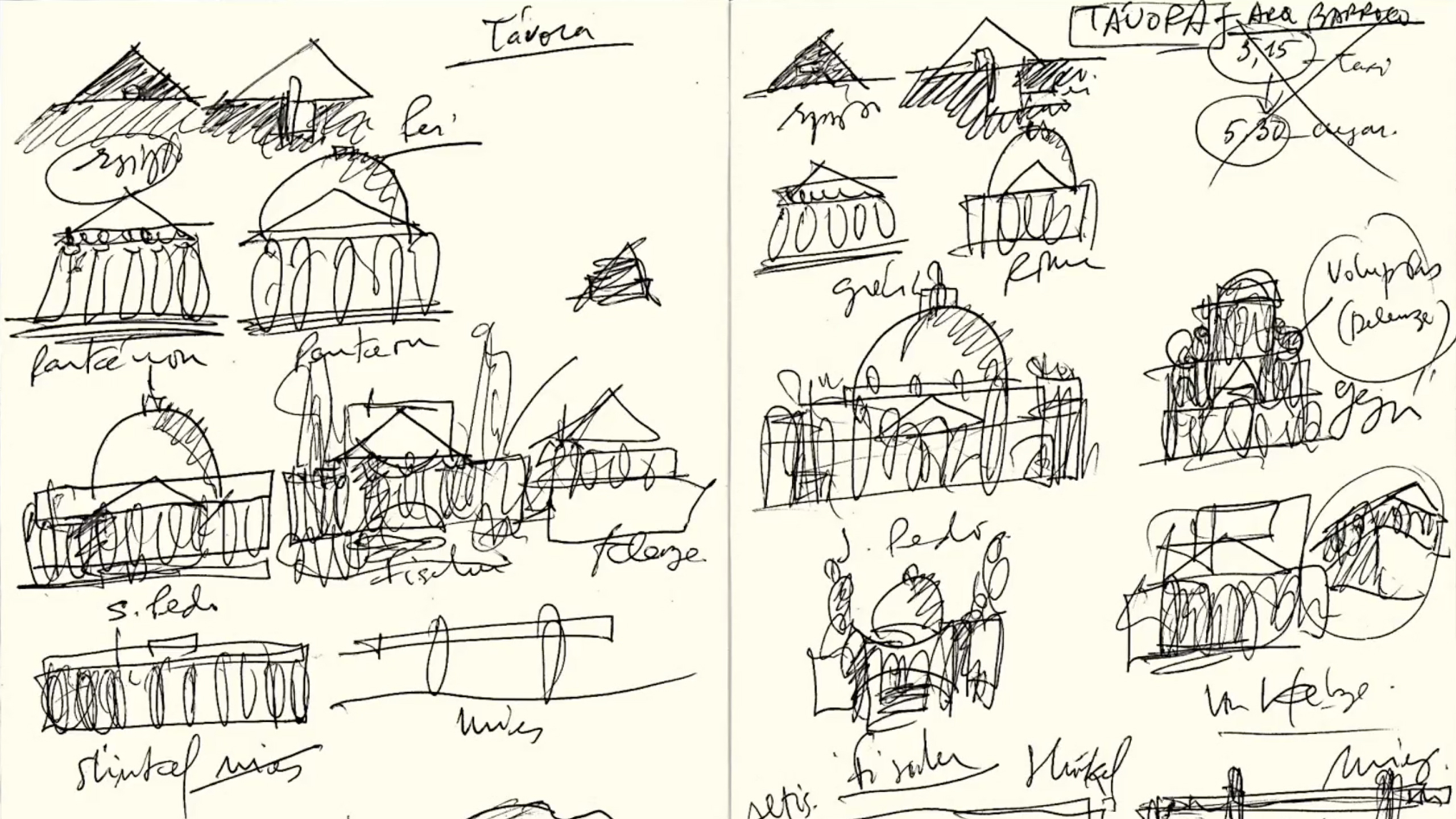 Between the pyramids of Ancient Egypt and Ieoh Ming Pei’s glass pyramid in Paris, a multiplicity of signs and fragments stimulate and inspire the architect, from Bernini to Schinkel to Alvaro Siza and Mies van der Rohe. The last one is precisely mentioned to reject the simplifying rhetoric of the Modern Movement that denies history. On the contrary, ESDM refers to Mies’ holidays in Greece, and he reflects on the importance of history.